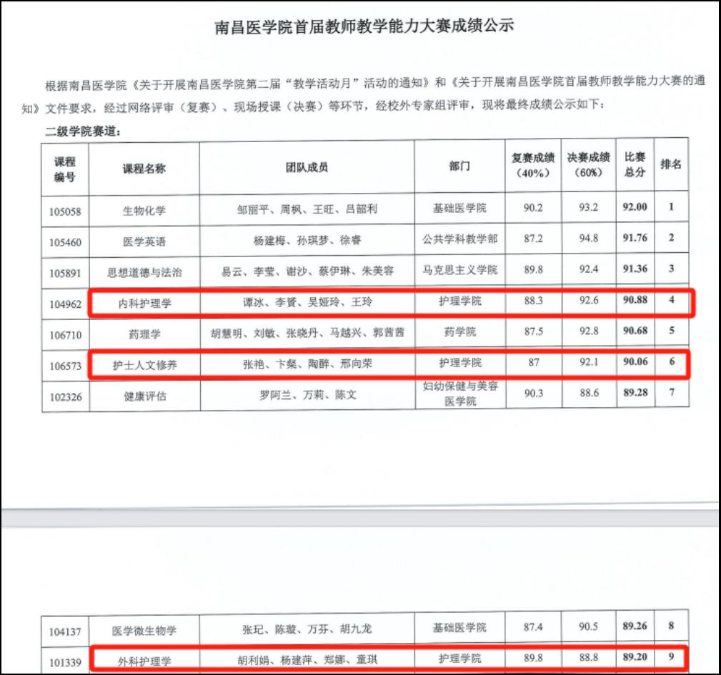 在首届教师教学能力大赛中,178体育直播谭冰等老师的《内科护理学》课程团队、张艳等老师的《护士人文修养》课程团队、胡利娟等老师的《外科护理学》课程团队分别取得第四名、第六名和第九名的佳绩。