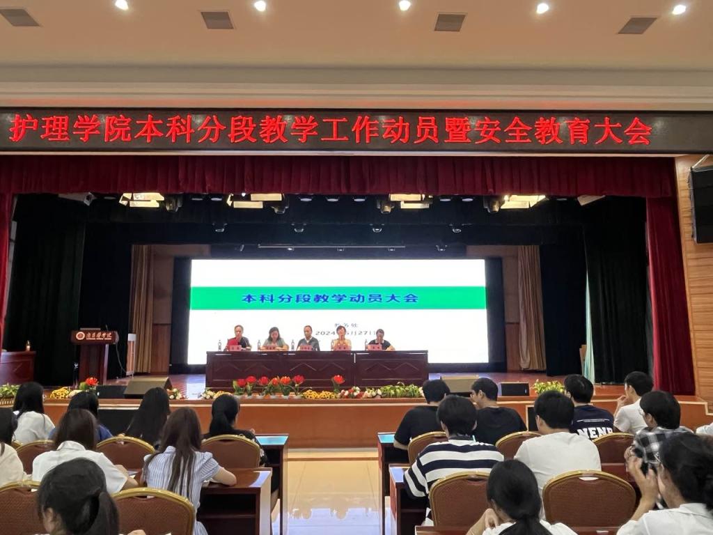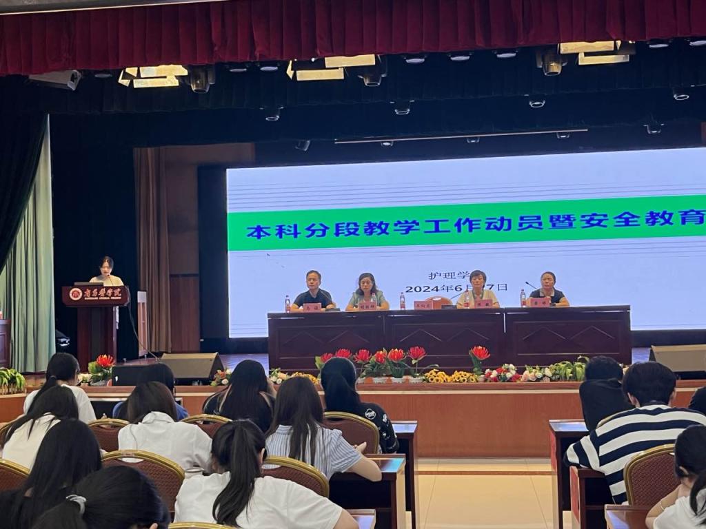 为深入贯彻落实国务院办公厅《关于加快医学教育创新发展的指导意见》精神,深入推进新医科建设,经学校党委审议决定2024年我校将在22级护理本科专业开展分段式教学改革。6月27日上午,178体育直播召开本科分段式教学动员暨安全教育大会。出席本次大会的有教务处实习科长王向东、178体育直播副院长胡颖辉、178体育直播党委副书记陈敏、178体育直播教学秘书唐婷、22级本科班辅导员及22级本科全体同学。会议由178体育直播团学办公室主任马俊主持。