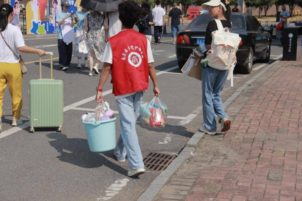 校门口到宿舍楼,短短几百米的路程,志愿者们顶着烈日往返数十次,衣服被汗水浸湿却毫无怨言。有的志愿者提前准备了小推车,专门帮助携带大件行李的新生;遇到行动不便的新生或陪同家长,志愿者还主动帮忙拎包、引路,用实际行动诠释 “奉献、友爱、互助、进步” 的志愿精神。